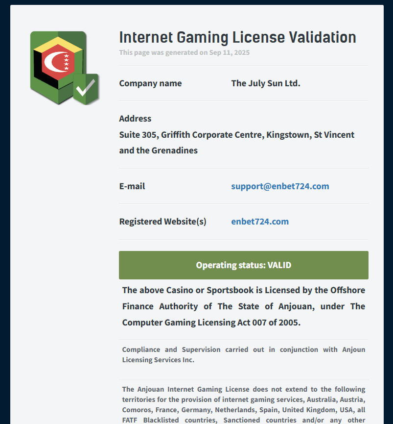 Enbet, 2007 yılında kurulan ve merkezi Çuraçao’da bulunan The July Sun B.V. adlı şirketin bir markasıdır.